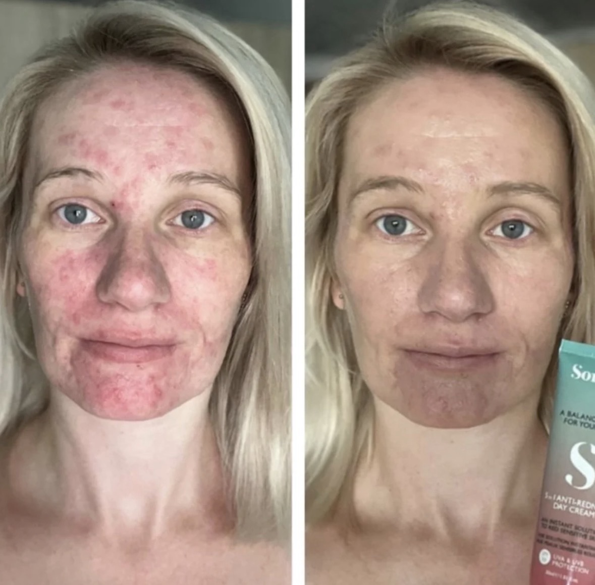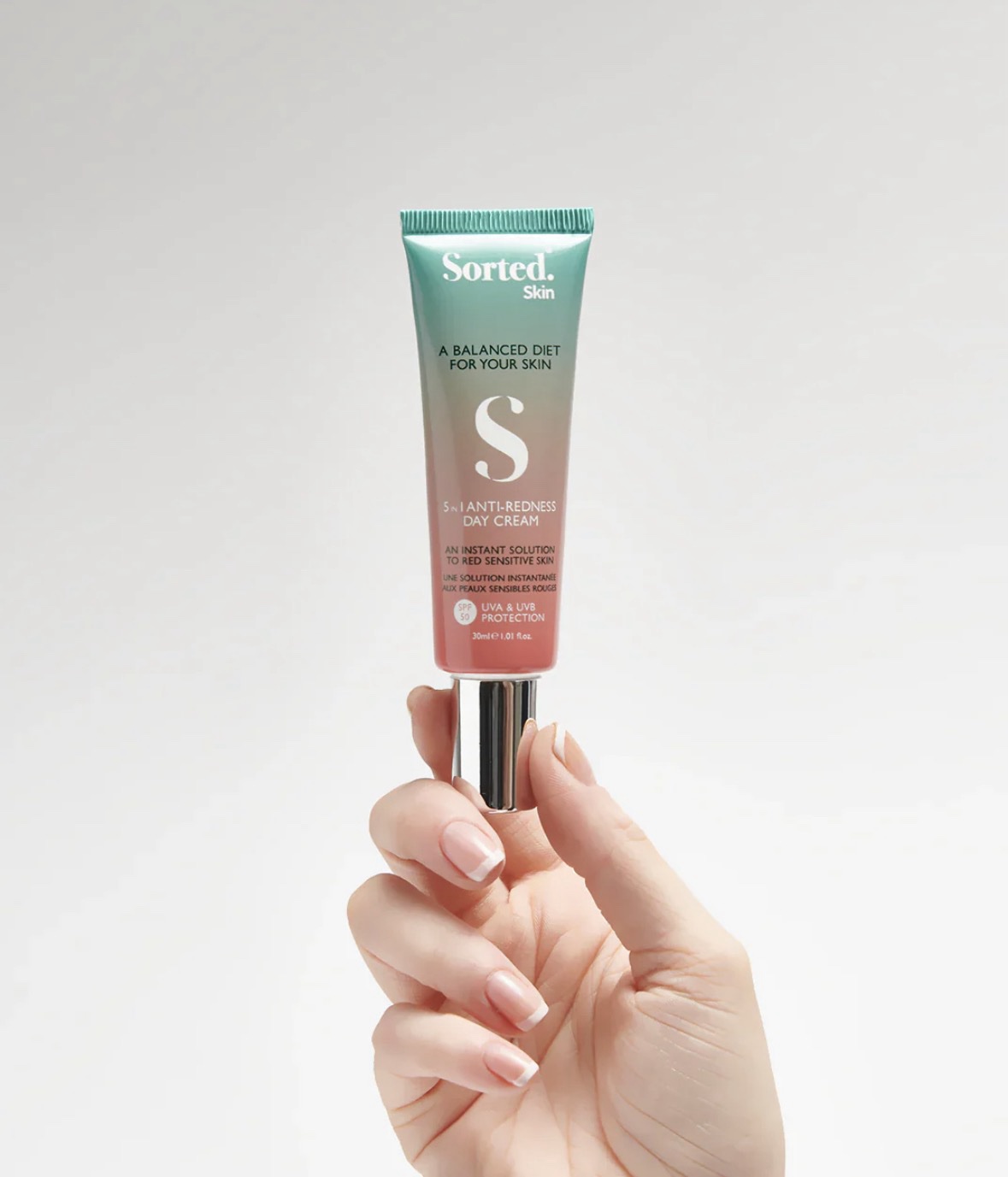 Sorted 5 in 1 Anti-Redness Day Cream. Et banebrydende hybridprodukt, der kombinerer præbiotisk hudpleje, anti-inflammatorisk behandling, digital lys- og solbeskyttelse samt farvekorrigerende teknologi i én enkel dagcreme.