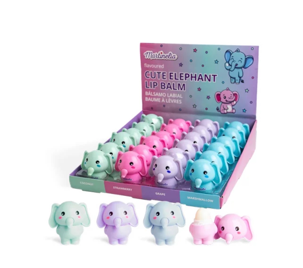 Sød elefant læbebalm i 4 forskellige farver/dufte.